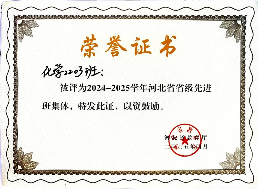 YABO鸭脖官网化学2203班以“志存高远,知行合一”为班训,荣获2024-2025学年“河北省省级先进班集体”称号。